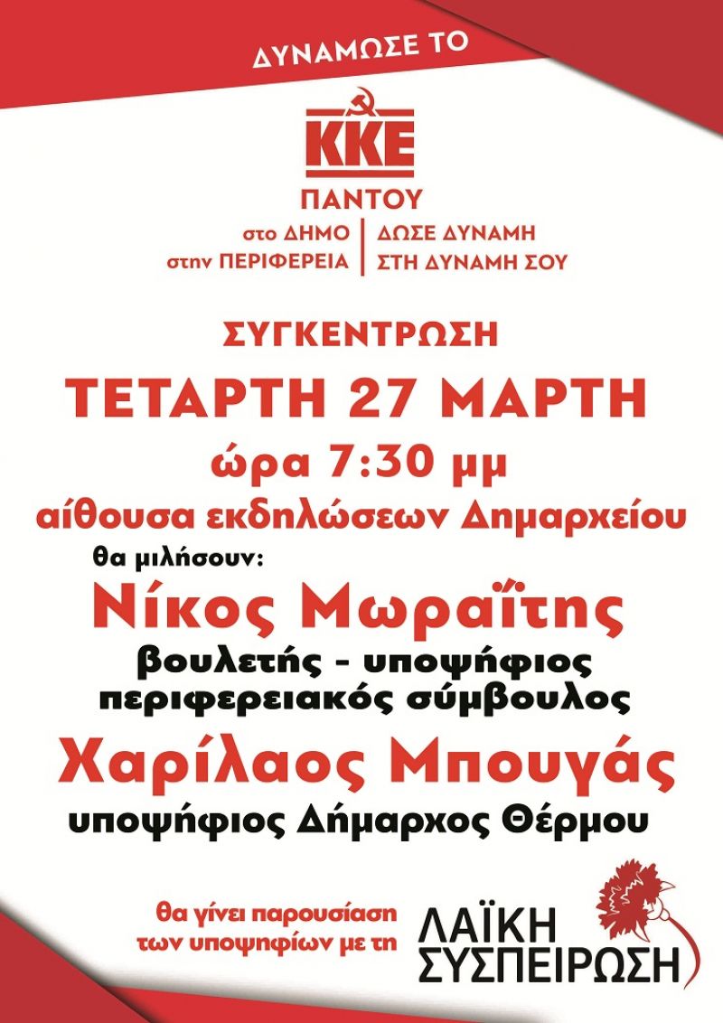 Η ΚΟΒ Θέρμου του ΚΚΕ διοργανώνει συγκέντρωση με σύνθημα «Δυνάμωσε το ΚΚΕ παντού! Στο δήμο, στην περιφέρεια, δώσε δύναμη, στη δύναμή σου!», την Τετάρτη 27 Μάρτη, στις 7:30 μμ, στην αίθουσα εκδηλώσεων του Δημαρχείου Θέρμου.