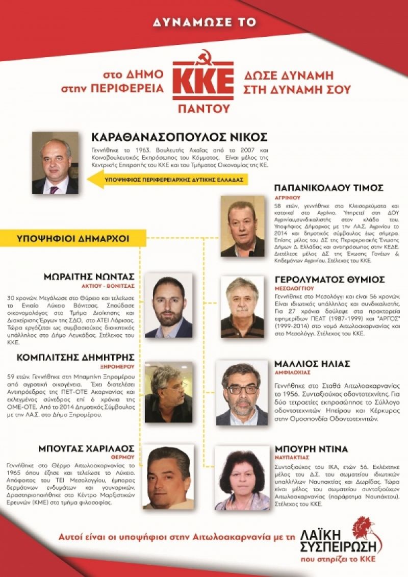 Ανακοίνωση- φυλλάδιο με τον υποψήφιο Περιφερειάρχη Δυτικής Ελλάδας Νίκο Καραθανασόπουλο και τους υποψήφιους δημάρχους με τη “Λαϊκή Συσπείρωση”, για κάθε έναν από τους δήμους της Αιτωλοακαρνανίας, εξέδωσε η Τομεακή Οργάνωση Αιτωλοακαρνανίας του ΚΚΕ. Στη σχετική ανακοίνωση αναφέρεται: