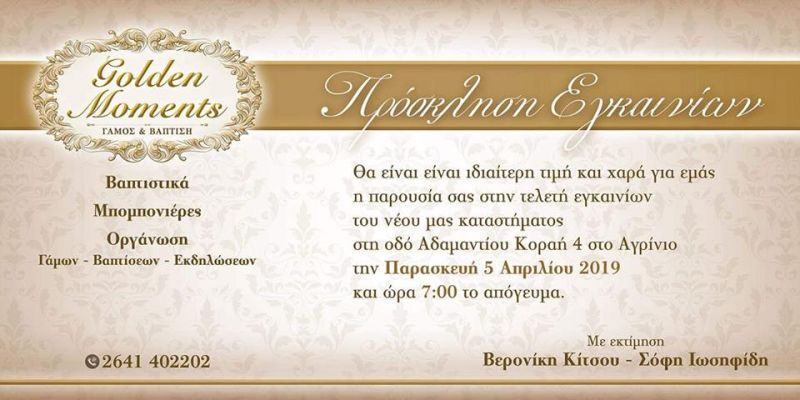Το κατάστημα με είδη γάμου – βάπτισης και οργάνωσης εκδηλώσεων Golden Moments προσκαλεί στα εγκαίνια του νέου του καταστήματος στο Αγρίνιο επι της οδού Αδαμαντίου Κοραή (πλατεία Δημάδη) την Παρασκευή 5 Απριλίου και ώρα 07:00 μμ. Η Χρύσα Σπαή μίλησε με την ιδιοκτήτρια της επιχειρήσης κα Βερονίκη Κίτσου και την κα Σόφη Ιωσηφίδη για τους αναγνώστες του AgrinioBestOf.gr