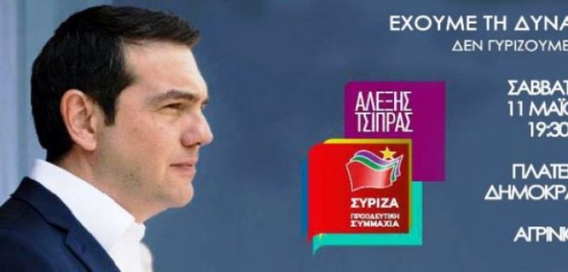 Επισημοποιήθηκε η ομιλία του πρωθυπουργού Αλέξη Τσίπρα, το Σάββατο, 11 Μαΐου, στο Αγρίνιο. Η ομιλία του κ. Τσίπρα θα πραγματοποιηθεί στις 19:30 το απόγευμα στην πλατεία Δημοκρατίας.