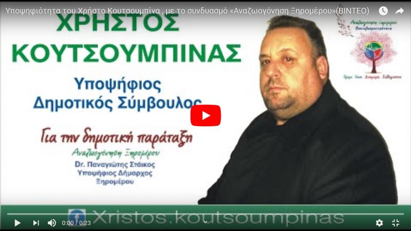 Δείτε το βίντεο μέσα απο το οποίο ανακοινώνει την υποψηφιοτητά του στον συνδυασμό "Αναζωογόνηση Ξηρομέρου" ο Χρήστος Κουτσομπίνας