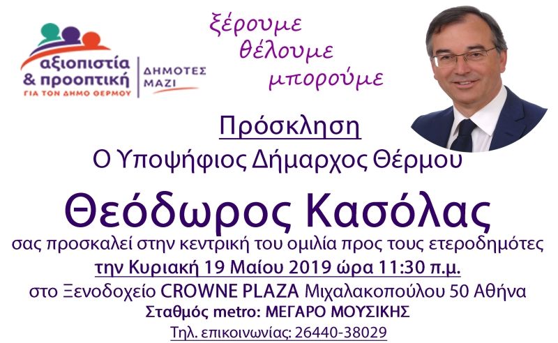 Ο Υποψήφιος Δήμαρχος Θέρμου Θεόδωρος Κασόλας σας προσκαλεί στην κεντρική του ομιλία προς τους ετεροδημότες την Κυριακή 19 Μαίου 2019 ώρα 11:30 π.μ.