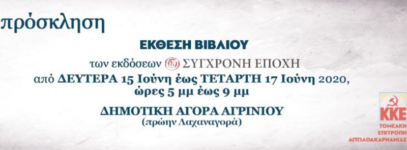 Η Τομεακή Επιτροπή Αιτωλοακαρνανίας του ΚΚΕ διοργανώνει έκθεση βιβλίου των εκδόσεων «Σύγχρονη Εποχή», από τη Δευτέρα 15 έως την Τετάρτη 17 Ιουνίου και ώρες 5μμ έως 9μμ, στη Δημοτική Αγορά Αγρινίου (πρώην Λαχαναγορά).