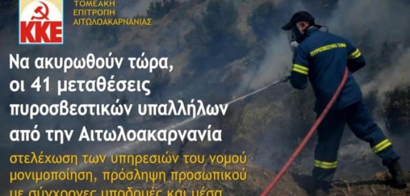 Η ΤΕ Αιτωλοακαρνανίας του ΚΚΕ τονίζει ότι, με τις μεταθέσεις αυτές υποβαθμίζονται ακόμα παραπέρα οι υπηρεσίες προστασίας των συμπολιτών μας, του περιβάλλοντος και των υποδομών του νομού μας, γι’ αυτό ζητάμε να ακυρωθούν όλες οι μεταθέσεις. Η μέθοδος ανακύκλωσης των ελλείψεων δεν λύνει προβλήματα αλλά τα πολλαπλασιάζει.