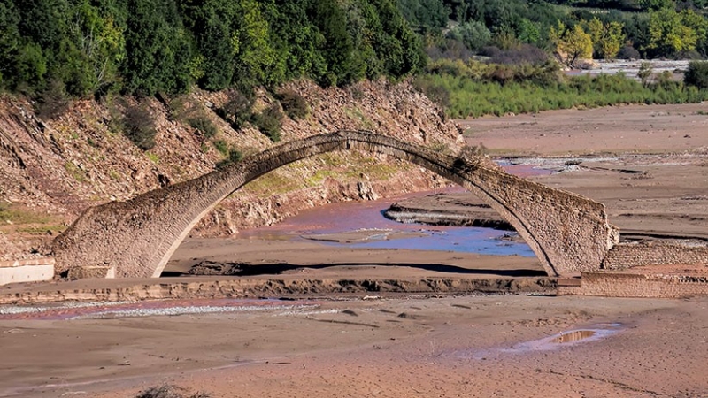 Λίγο πιό κατω, το 1964 κατασκεύαστηκε το φράγμα των Κρεμαστών που δημιούργησε την ομώνυμη τεχνητή λίμνη. Ήταν φυσικό ότι η λίμνη θα ανέβαζε την στάθμη του νερού κοντά στις εκβολές των ποταμών. Επειδή το γεφύρι του Μανώλη βρίσκεται στις παρυφές της λίμνης, ανάλογα με το ύψος των βροχοπτώσεων κάθε χρονιάς, άρχισε πότε να εμφανίζεται και να εξαφανίζεται.Σήμερα δεν έχει ορατό μονοπάτι να το ενώνει με τις όχθες του Αγραφιώτη. Συνήθως τον χειμώνα ξεχωρίζει μόνο η κορυφή του τόξου, ενώ το καλοκαίρι φαίνεται ολόκληρο. Είναι πια πνιγμένο στο νερό και αντιστέκεται στον χρόνο και στον Αγραφιώτη.Το γεφύρι του Μανώλη είναι ένα πέτρινο μονότοξο γεφύρι διαμέτρου περίπου 30 μέτρων, που κατασκεύαστηκε στην περίοδο της ύστερης τουρκοκρατίας το 1659.