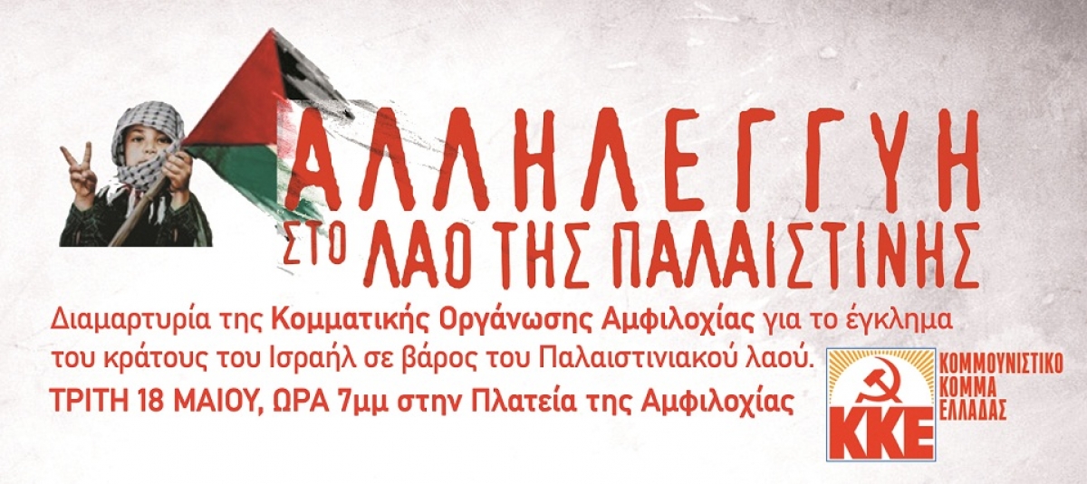 Η Κομματική Οργάνωση Αμφιλοχίας του ΚΚΕ οργανώνει πικετοφορία-διαμαρτυρία στην Πλατεία της Αμφιλοχίας την Τρίτη 18 Μαΐου και ώρα 7 μ.μ. για το «έγκλημα του κράτους του Ισραήλ σε βάρος του Παλαιστινιακού λαού».
