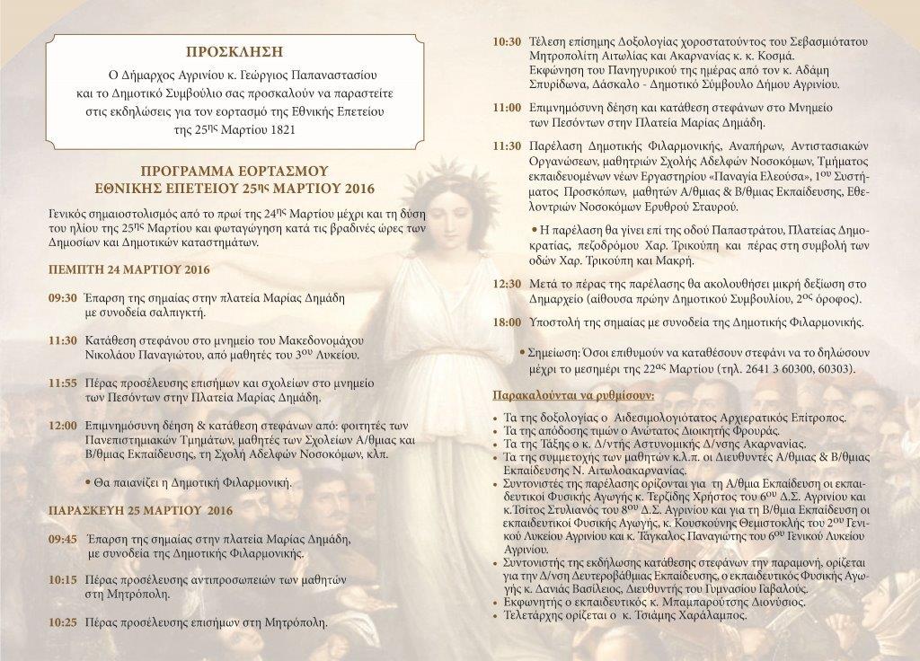 Ο Δήμος Αγρινίου ανακοίνωσε το πρόγραμμα εορτασμού της Εθνικής Επετείου της 25ης Μαρτίου 1821, που ξεκινά με σημαιοστολισμό και εκδηλώσεις από το πρωί της 24ης Μαρτίου.