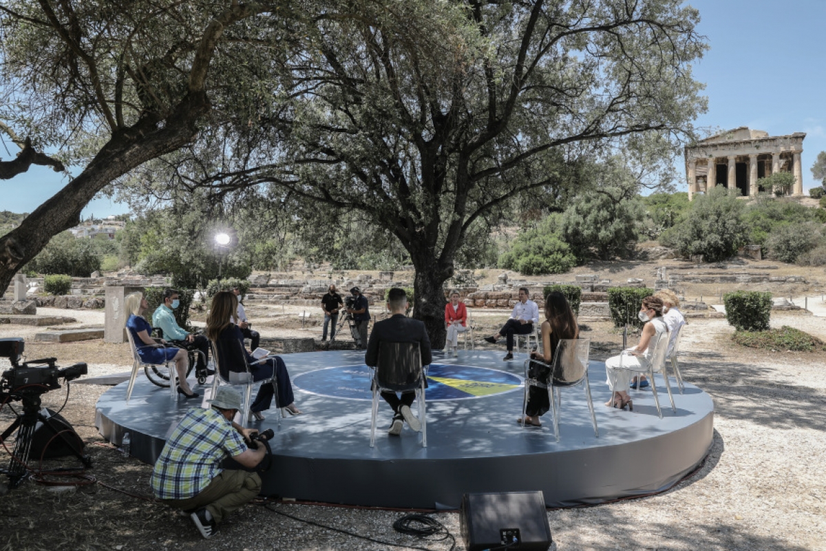 Αμέσως μετά την ολοκλήρωση της παρουσίασης των δράσεων του Εθνικού Σχεδίου Ανάκαμψης και Ανθεκτικότητας «Ελλάδα 2.0» στον χώρο της Αρχαίας Αγοράς, ο πρωθυπουργός Κυριάκος Μητσοτάκης και η πρόεδρος της Ευρωπαϊκής Επιτροπής, Ούρσουλα Φον ντερ Λάιεν, συνομίλησαν με πολίτες και απάντησαν σε ερωτήσεις τους.