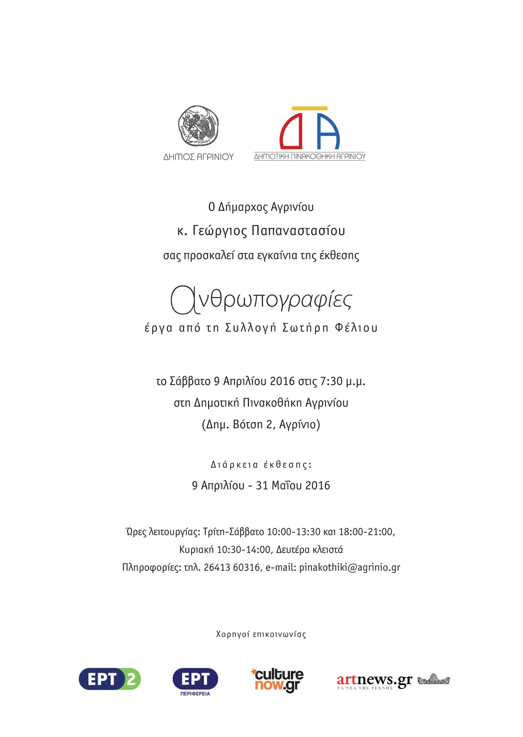Η Δημοτική Πινακοθήκη Αγρινίου σε συνεργασία με το Ίδρυμα «Η άλλη Αρκαδία» διοργανώνει την έκθεση «Ανθρωπογραφίες» με έργα από τη Συλλογή Σωτήρη Φέλιου.