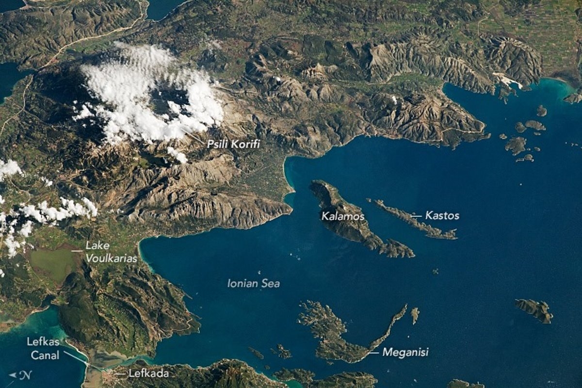 Τα νησιά Καστός, Κάλαμος, Μεγανήσι, Άτοκος και Λευκάδα, τα οποία φαίνονται στη φωτογραφία, είναι μερικά από τα πολλά νησιά του Ιονίου Πελάγους. Αυτή η περιοχή είναι η πιο ενεργή σεισμικά περιοχή στην ανατολική Μεσόγειο και οι κοντινές ακτές έχουν βιώσει πολλαπλά τσουνάμι τα τελευταία χιλιάδες χρόνια.