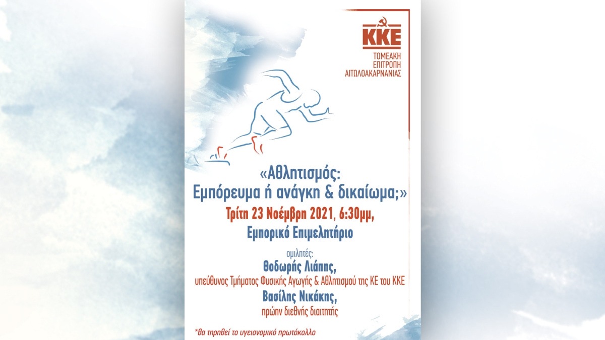 Εκδήλωση με θέμα «Αθλητισμός: Εμπόρευμα ή ανάγκη και δικαίωμα;» διοργανώνει την Τρίτη 23 Νοέμβρη, στις 6.30 μ.μ. στο Εμπορικό Επιμελητήριο Αιτωλοακαρνανίας στο Αγρίνιο, η Τομεακή Επιτροπή Αιτωλοακαρνανίας του ΚΚΕ.