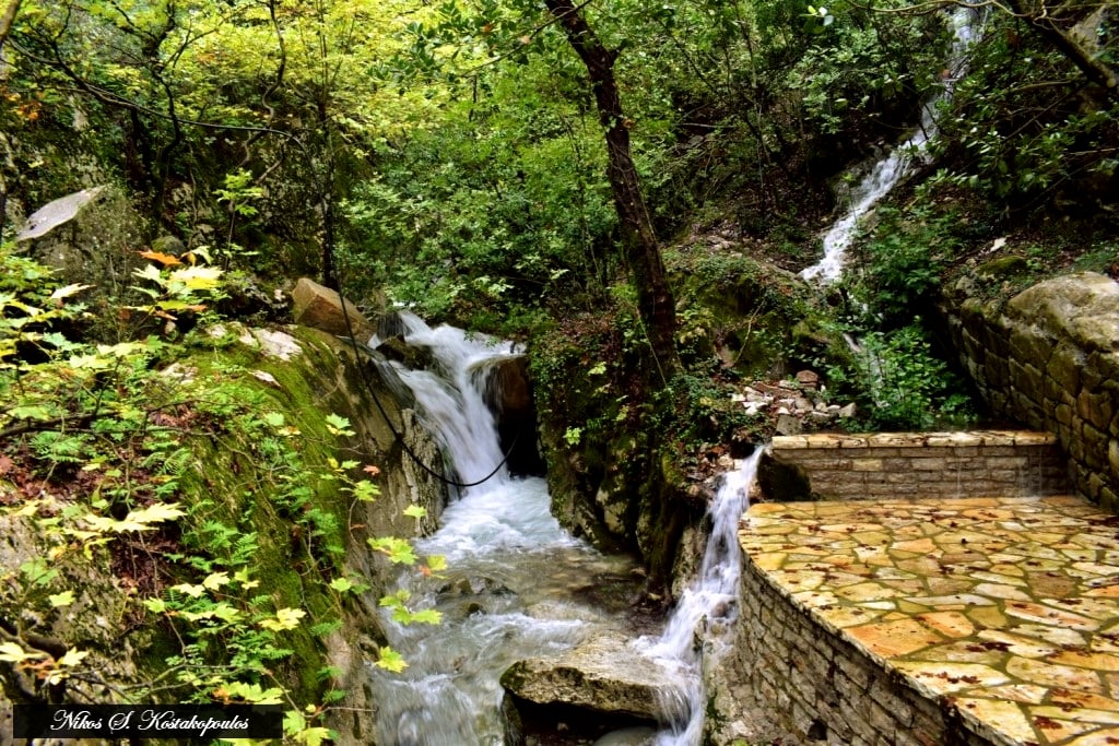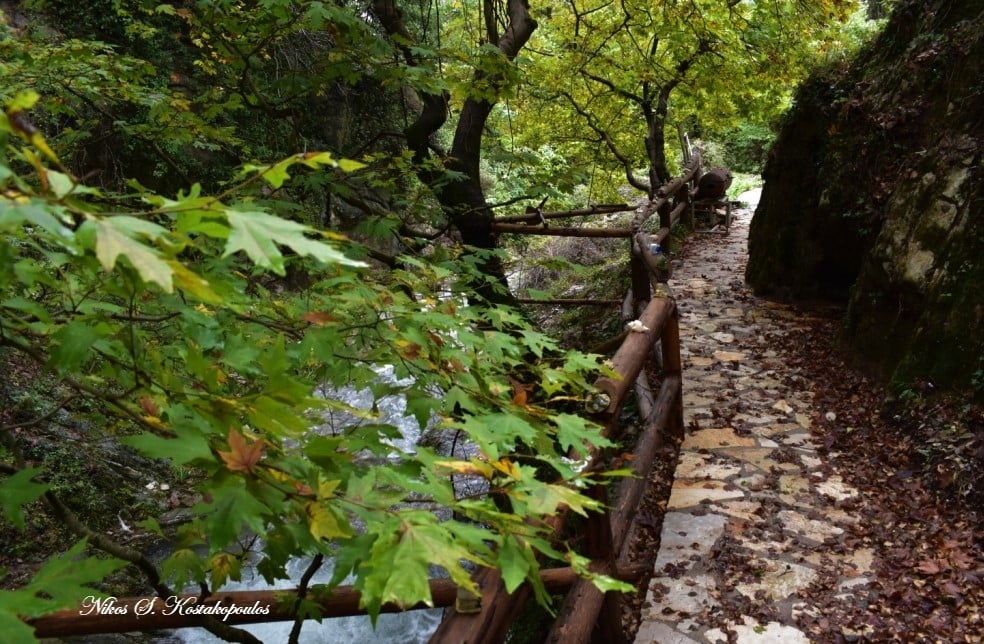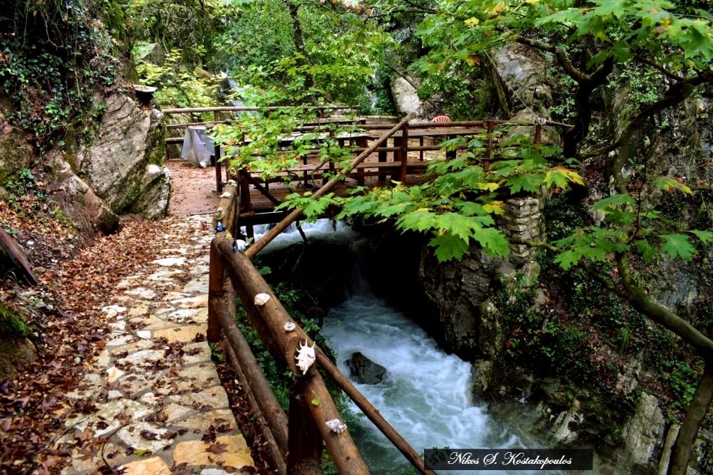 Μια κατασκευή πολύ όμορφη και λειτουργική, με τα καθιστικά της και με τον ξύλινο φράκτη από τις δυο ελεύθερες πλευρές της φτιαγμένο από ακατέργαστους κορμούς δένδρων προς προστασία των επισκεπτών, καθώς από τις άλλες δύο πλευρές της προστασία προσφέρουν οι βράχοι των πρανών εκατέρωθεν του ρέματος. Κι είναι τόσο ταιριαστά το ξύλο και η πέτρα σ’ αυτόν τον υπέροχο έτσι κι αλλιώς χώρο!