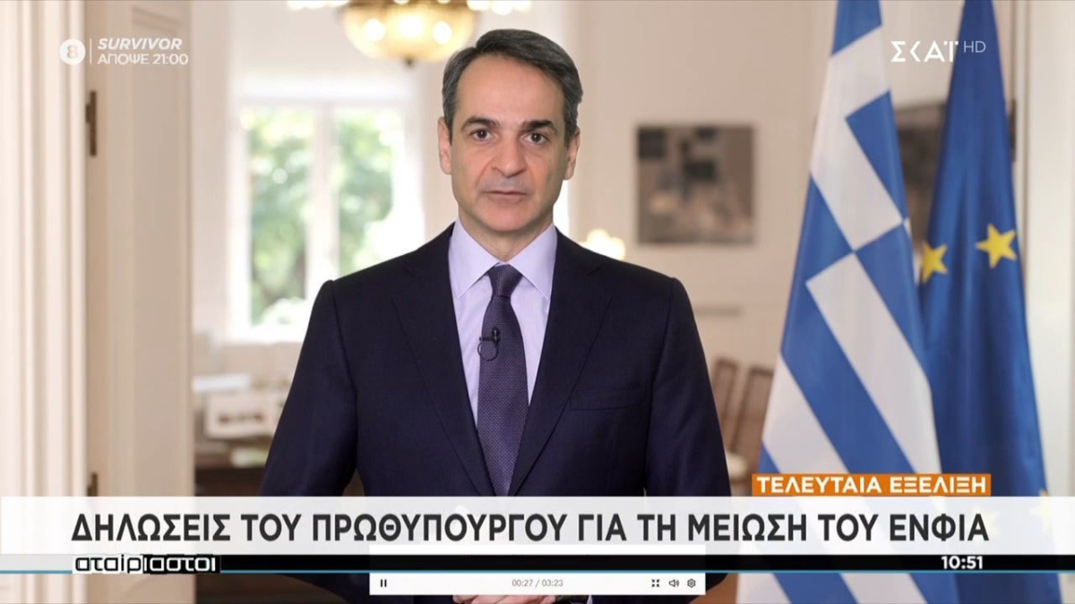 Τη μόνιμη μείωση του ΕΝΦΙΑ κατά 13% ανακοίνωσε σε… έκτακτο τηλεοπτικό του μήνυμα ο πρωθυπουργός, Κυριάκος Μητσοτάκης.