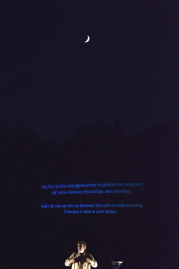 Η παράσταση άρχισε μόλις ο ήλιος έδυσε και το σκοτάδι που απλώθηκε στο χώρο υπήρξε ένα από τα στοιχεία της μυσταγωγίας και του δέους της παράστασης. Οι υπέρτιτλοι στα νέα ελληνικά και στα αγγλικά, υπήρξαν ο οδηγός για την κατανόηση του ακούσματος του αρχαίου λόγου.