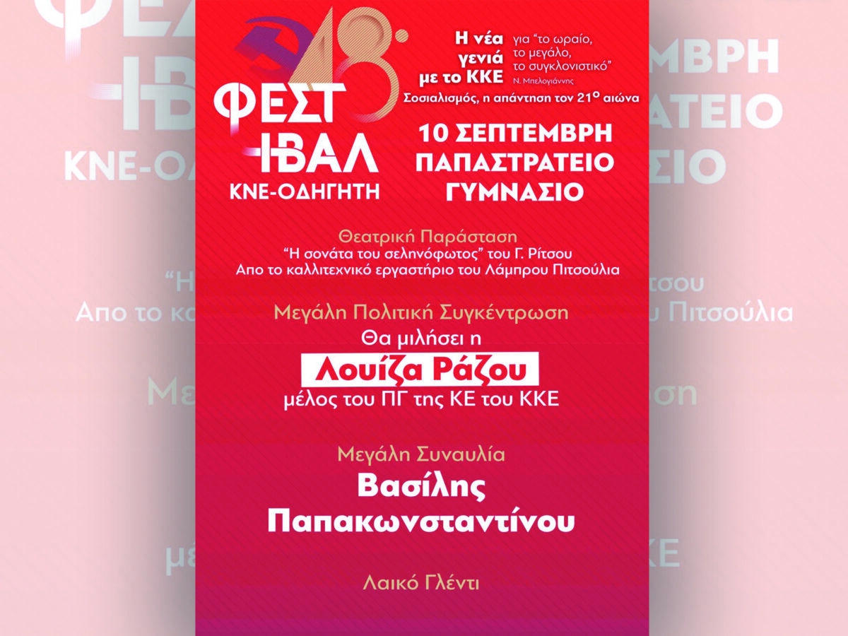 Το 48ο Φεστιβάλ ΚΝΕ-Οδηγητή «ταξιδεύει» ήδη σε όλη την Ελλάδα και στην Αιτωλοακαρνανία οι εκδηλώσεις του, θα κορυφωθούν στο Αγρίνιο το Σάββατο 10 Σεπτεμβρίου στο Παπαστράτειο Γυμνάσιο.