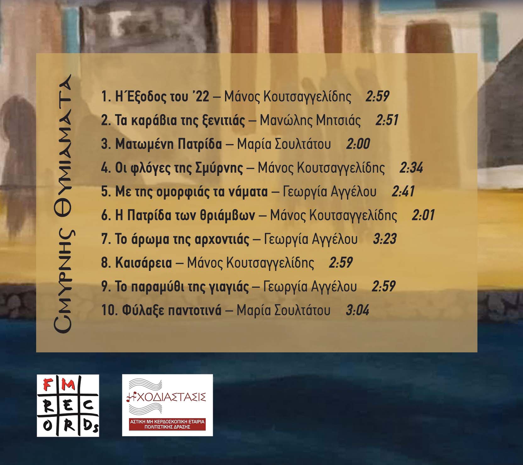 Με αφορμή τα 100 χρόνια από την Μικρασιατική Καταστροφή, δημιουργήθηκε το album«Σμύρνης Θυμιάματα»και περιλαμβάνει δέκα τραγούδια – ποιήματα που έχω μελοποιήσει από την ποιητική συλλογή «Γράμματα στην Ιωνία» του Ίωνα ποιητή Γιάννη Π. Ιωαννίδη.