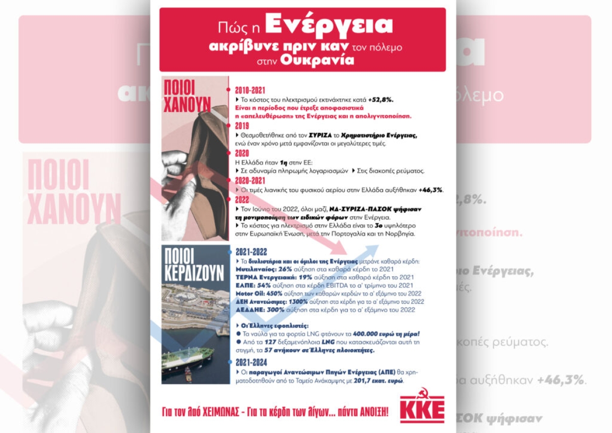 Με αυτόν τον τρόπο συγκαλύπτουν ότι η ενεργειακή φτώχεια κι ακρίβεια, τόσο στην Ελλάδα, όσο και σ’ όλο τον κόσμο, δεν είναι “φυσικό φαινόμενο”, αλλά αποτέλεσμα της ίδιας ακριβώς στρατηγικής -πολύ πριν τον ιμπεριαλιστικό πόλεμο στην Ουκρανία- που και οι ίδιοι εφάρμοσαν ως κυβερνήσεις. Το πιο σημαντικό, όμως, είναι ότι και οι δύο κοροϊδεύουν απροκάλυπτα τον ελληνικό λαό, με δήθεν “λύσεις” και προτάσεις, οι οποίες δεν αμφισβητούν στο ελάχιστο τους μηχανισμούς που εκτινάσσουν τις τιμές στην ενέργεια, σε βάρος των λαϊκών νοικοκυριών και υπέρ των κερδών των ενεργειακών ομίλων. Η διαφορά τους βρίσκεται μόνο στον τρόπο που οι λαοί θα πληρώσουν αυτά τα κέρδη.
