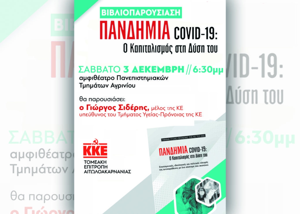Βιβλιοπαρουσίαση της έκδοσης «Πανδημία COVID-19: Ο καπιταλισμός στη Δύση του» διοργανώνει το Σάββατο 3 Δεκεμβρίου, στις 6:30 μμ, στο αμφιθέατρο των Πανεπιστημιακών Τμημάτων Αγρινίου, η Τομεακή Επιτροπή Αιτωλοακαρνανίας του ΚΚΕ.