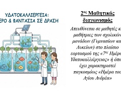 Στις 28 Νοεμβρίου 2025 στο πλαίσιο εορτασμού της 7ης ημέρας Υδατοκαλλιέργειας θα πραγματοποιηθεί ο 2ος μαθητικός διαγωνισμός με θέμα την «Υδατοκαλλιέργεια». Απευθύνεται σε μαθητές και μαθήτριες των σχολικών μονάδων (Γυμνασίων και Λυκείων) και θα λάβει χώρα στο Κεντρικό αμφιθέατρο Τμήματος Αλιείας και Υδατοκαλλιεργειών του Πανεπιστημίου Πατρών στο Μεσολόγγι. agrinionews.gr
