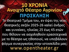 Το Θεατρικό Τμήμα Ανοιχτού Θεάτρου Αγρινίου, εορτάζοντας τα 10 χρόνια δράσης και παρουσίας στα θεατρικά δρώμενα, αναζητά άνδρες και γυναίκες, ερασιτέχνες ηθοποιούς ή και άτομα που θέλουν να ασχοληθούν για πρώτη φορά με το θέατρο, για την νέα του θεατρική παραγωγή 2025-26. Οι υποψήφιοι θα πρέπει να διαμένουν στην περιοχή Αγρινίου και να είναι ηλικίας 25 έως 45 ετών. Δεν είναι απαραίτητη η…