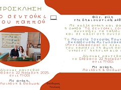 Η δημιουργική ομάδα "Το σεντούκι του παππού" σας προσκαλεί στο Μουσείο Ιστορίας Πρωτοβάθμιας Εκπαίδευσης Αιτωλοακαρνανίας (Αγγελόκαστρο) για ένα εργαστήρι δημιουργικής μάθησης που συνδυάζει την αγάπη για την Ποίηση και την Τεχνολογία. Το Σάββατο 22 Νοέμβρη 2025, στις 17:00 θα πραγματοποιηθεί ένα εργαστήρι ηχογράφησης για μικρούς και μεγάλους με στόχο να "ντυθεί" ηχητικά μια ιστορία. Η παρουσία…