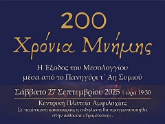 Το θεατρικό δρώμενο «200 Χρόνια Μνήμης – Η Έξοδος του Μεσολογγίου μέσα από το Πανηγύρι τ’ Αη-Συμιού» φιλοξενεί ο Δήμος Αμφιλοχίας το Σάββατο 27 Σεπτεμβρίου στις 19:30 μ.μ. στην κεντρική πλατεία Αμφιλοχίας - Στις 18:00 μ.μ. τιμητική εκδήλωση για τους απογόνους των Βαλτινών Αγωνιστών Στο πλαίσιο του εορτασμού για τα 200 χρόνια από τη Μάχη του Καρβασαρά ο Δήμος Αμφιλοχίας υποδέχεται το Σάββατο 27…