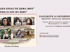 «ΑΥΤΟ ΔΕΝ ΕΙΝΑΙ ΤΟ ΣΩΜΑ ΜΟΥ» στην Αρχαία Μεσσήνη Για πρώτη φορά, στις 10 Οκτωβρίου στις 18.00, "ζωντανεύουν" στην Αρχαία Μεσσήνη ιστορίες ηρωίδων από τις "Μεταμορφώσεις" του Οβιδίου. 4 ηθοποιοί από διαφορετικές χώρες ενσαρκώνουν: τη Σκύλλα, τη Μέδουσα, την Ηώ, την Αράχνη, την Ιό, την Ηχώ, τη Δάφνη, και πολλές άλλες ηρωίδες, σε 7 Ιστορίες πάθους που μετατράπηκαν σε εκδίκηση από τους Θεούς. «Αυτό…