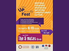 Την Τετάρτη 8 Οκτωβρίου 2025, ο Δήμος Ιερής Πόλης Μεσολογγίου και το Πανεπιστήμιο Πατρών υποδέχονται τους πρωτοετείς φοιτητές με το «Welcome to Up Fest»! Στην πλατεία Μπότσαρη, στις 19:30, μας περιμένει DJ Set και στις 20:30 συναυλία με τους «The 5 mates». Ελάτε όλοι να καλωσορίσουμε μαζί τους νέους φοιτητές της ακαδημαϊκής χρονιάς 2025-2026 που θα φοιτήσουν στις Πανεπιστημιακές Σχολές της πόλης…