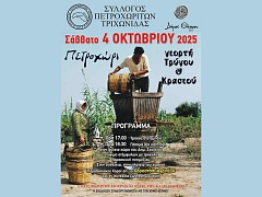 Ο ΣΥΛΛΟΓΟΣ ΠETPOXΩPITΩN ΤΡΙΧΩΝΙΔΑΣ σας καλεί το Σάββατο 4 Οκτωβρίου 2025 στην γιορτή Τρύγου & Κρασιού στο Πετροχώρι Θέρμου ΠΡΟΓΡΑΜΜΑ Ώρα 17:00 Τρύγος στο αμπέλιΏρα 18:30 Πάτημα στο πατητήρι στον αύλειο χώρο του Δημ . Σχολείουστίψιμο στέμφυλων με τρόκολοπαρασκευή πετιμεζιού Στην συνέχεια, στην πλατεία του χωριούΠαραδοσιακοί Χοροί απ' το Χοροστάσι Αγρινίου και εν συνεχεία ζωντανή μουσική ΕΜΕΙΣ…